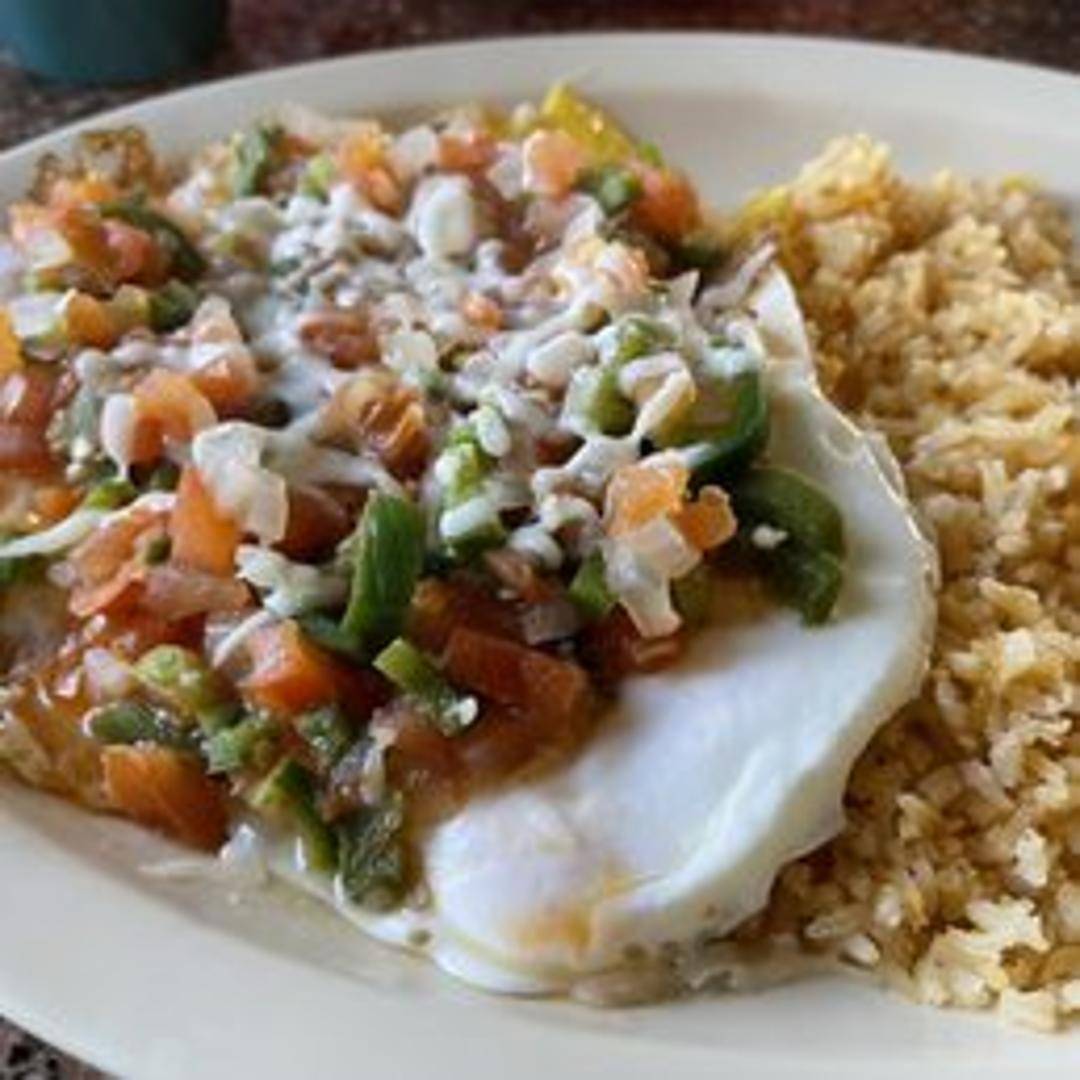 Two fried eggs served on lightly fried corn tortillas and smothered in a zesty ranchero sauce. Accompanied by refried beans and your choice of breakfast potatoes or rice.