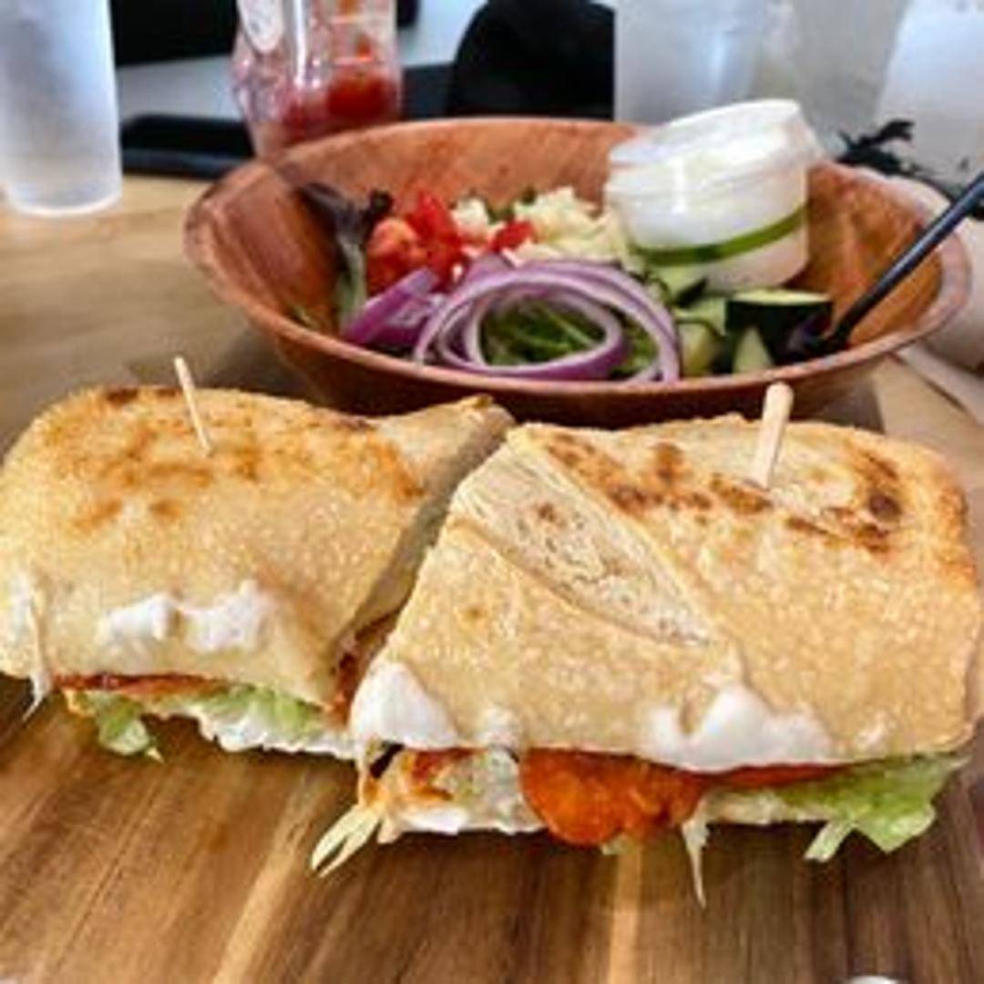 Crispy fried chicken breast coated in spicy buffalo sauce, served on a toasted bun with lettuce, tomato, and a creamy ranch or blue cheese dressing.