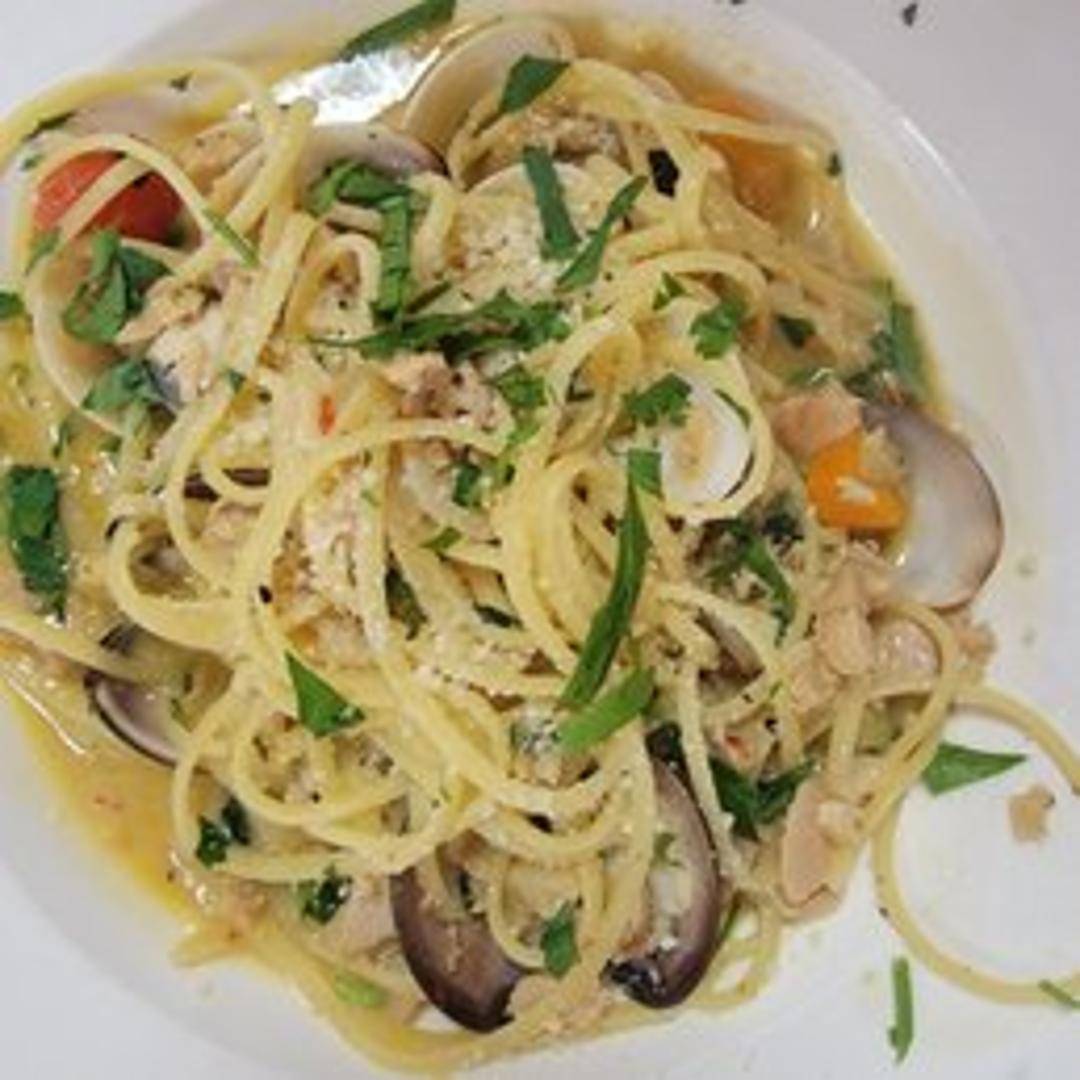 Linguine pasta tossed with fresh clams in a white wine garlic sauce. Garnished with parsley and served hot.