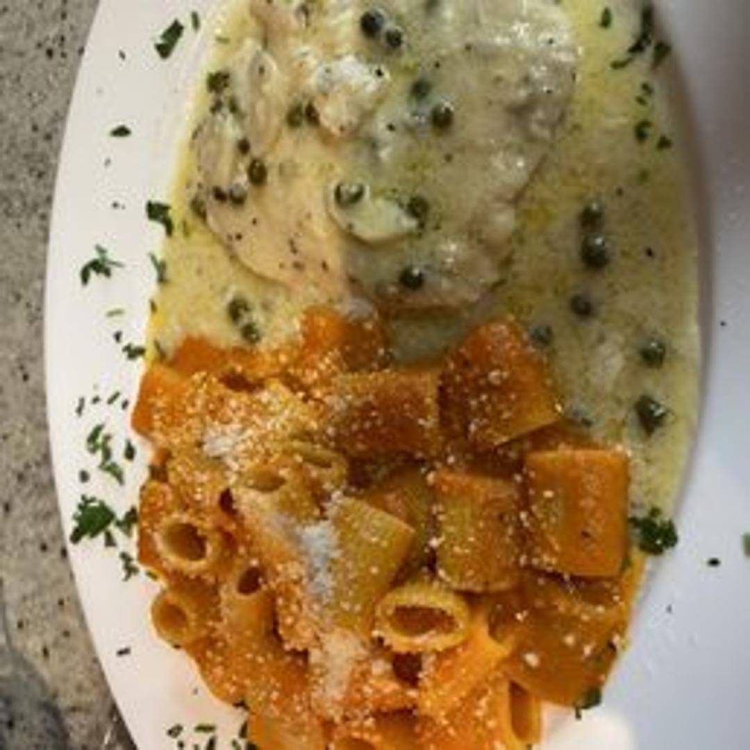 Pan-fried chicken cutlets in a lemon-butter and caper sauce. Served with a side of pasta.