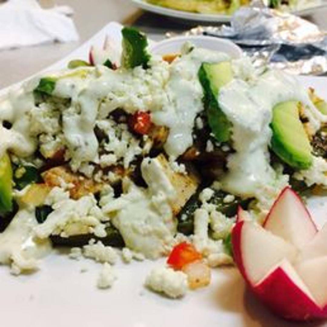 A large, thick, handmade corn masa base topped with refried beans, your choice of protein (steak, chicken, carnitas, or al pastor), lettuce, tomato, onions, cheese, and sour cream.