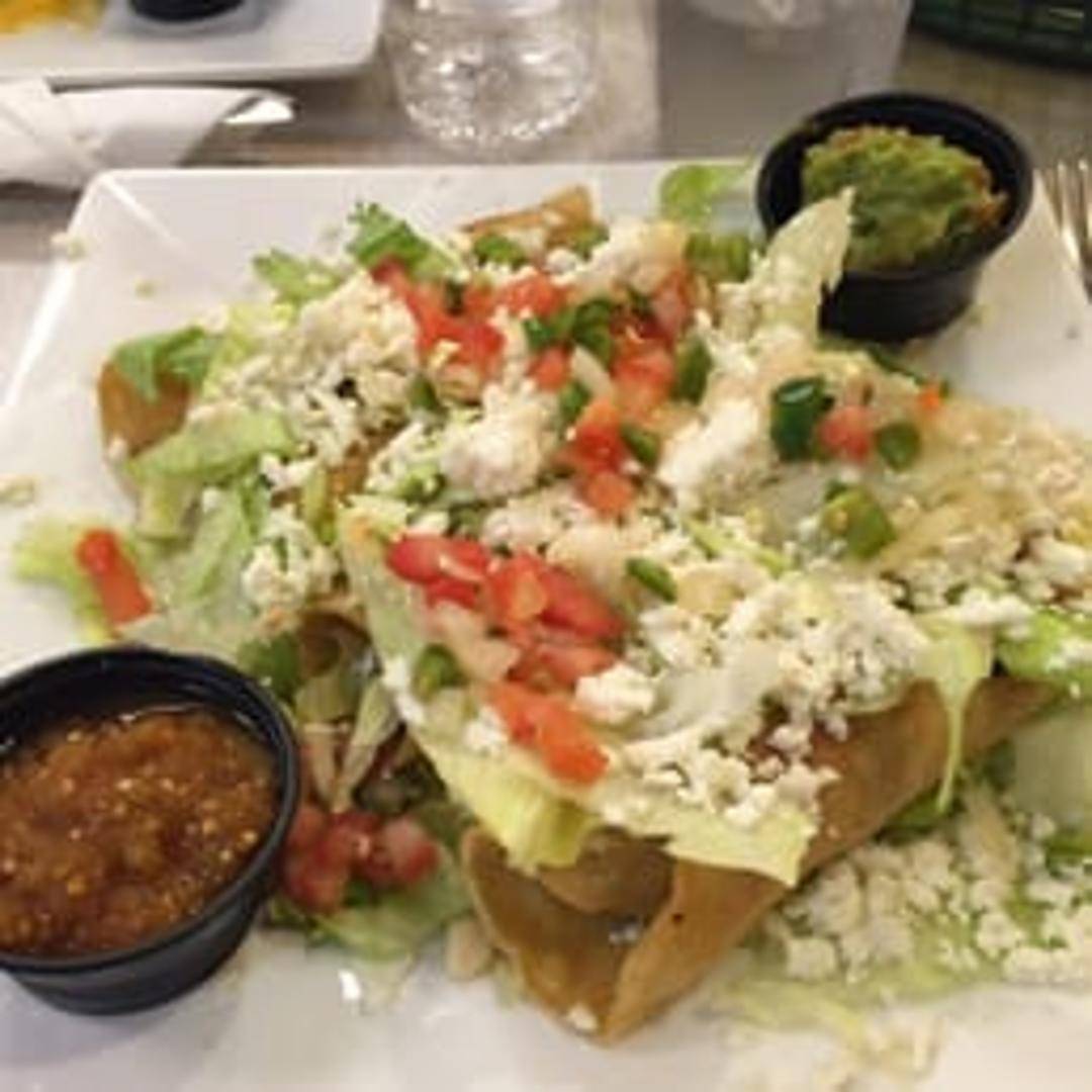 Crispy, golden-fried corn tortillas filled with your choice of shredded chicken or potato. Topped with shredded lettuce, pico de gallo, queso fresco, and a drizzle of crema.