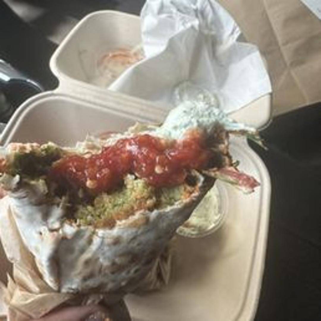 A warm pita bread filled with crispy, golden-brown falafel, fresh vegetables (such as lettuce, tomatoes, and cucumbers), and a creamy tahini sauce. May contain pickles and hummus. A flavorful and satisfying vegetarian option.