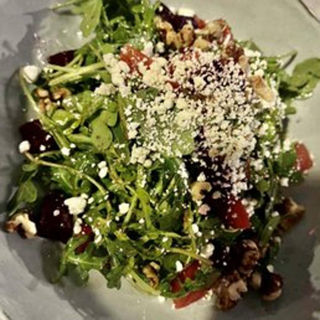 A vibrant and refreshing salad featuring tender, roasted baby beets served atop a bed of mixed greens. Complemented by a light vinaigrette dressing, crumbled goat cheese for tanginess, and toasted walnuts for a satisfying crunch. A perfect light lunch or flavorful starter.