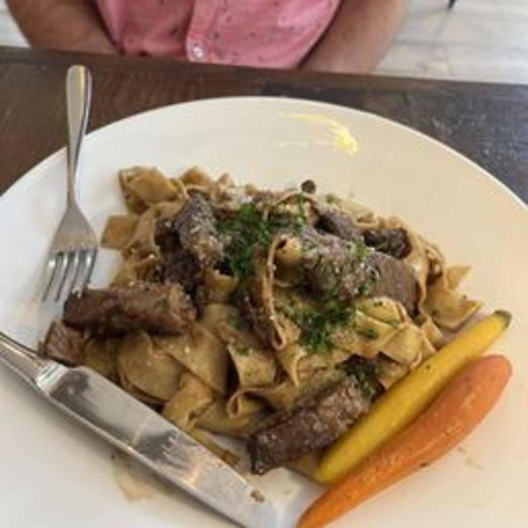 Wide pappardelle pasta served with tender, slow-braised short ribs in a savory and hearty sauce. A comforting and flavorful dish perfect for a satisfying meal.