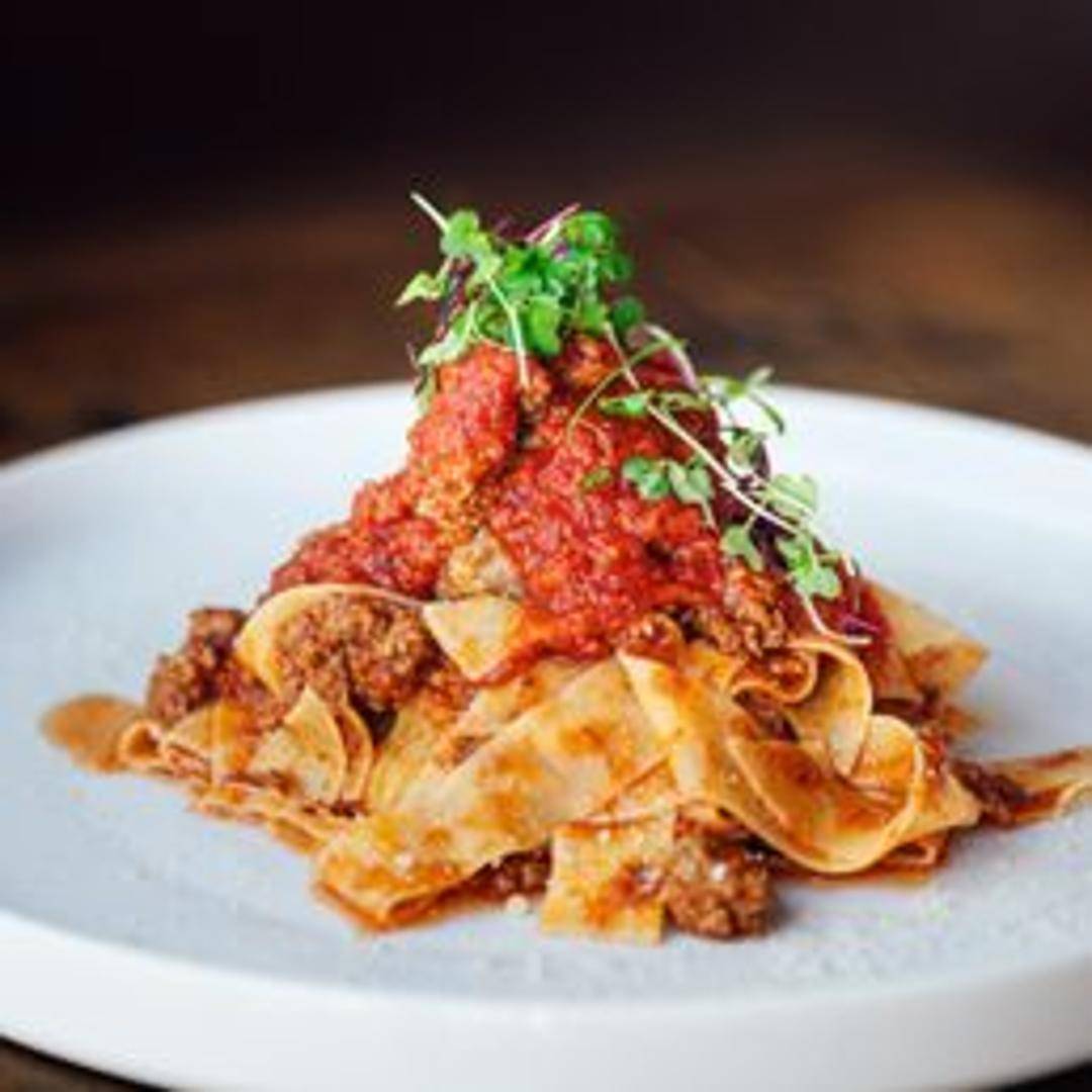Wide pappardelle pasta coated in a slow-cooked, rich Bolognese sauce made with ground meat, vegetables, and tomatoes. A traditional and flavorful Italian pasta dish.