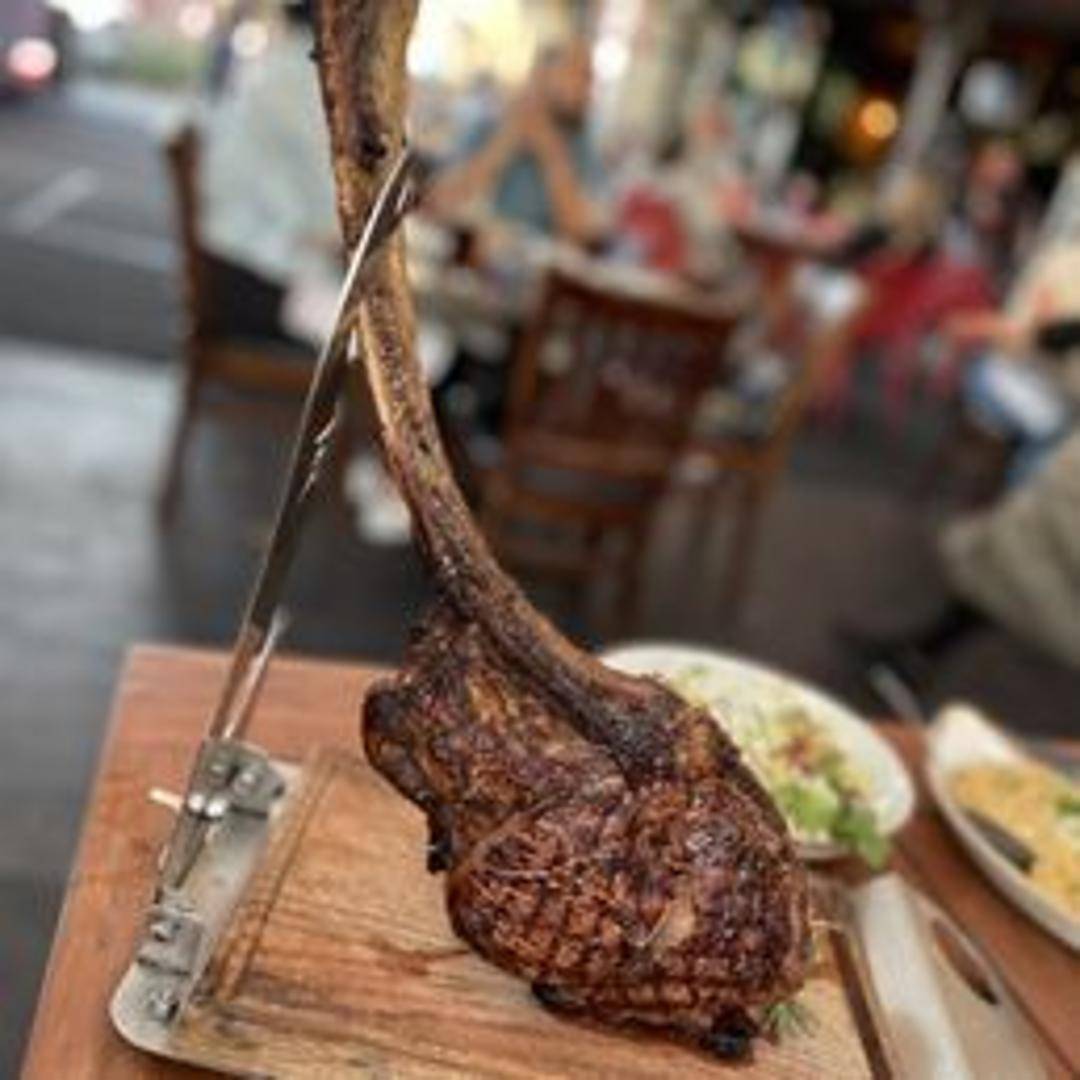 A bone-in ribeye steak, expertly grilled to your desired doneness. Impressive in size and flavor, this cut offers a rich, marbled texture and a tender, juicy bite.