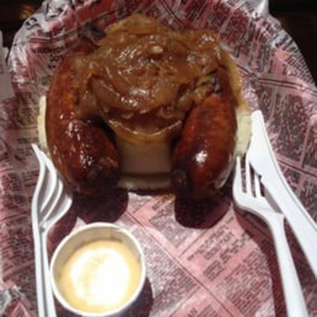 Traditional British sausages (bangers) served atop a generous portion of creamy mashed potatoes. Drizzled with rich onion gravy.