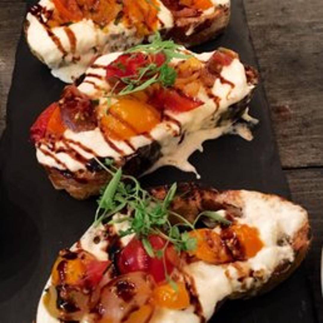 Toasted artisanal bread topped with creamy burrata cheese, ripe cherry tomatoes, basil pesto, a drizzle of balsamic glaze, and extra virgin olive oil. Seasoned with salt and freshly ground black pepper.