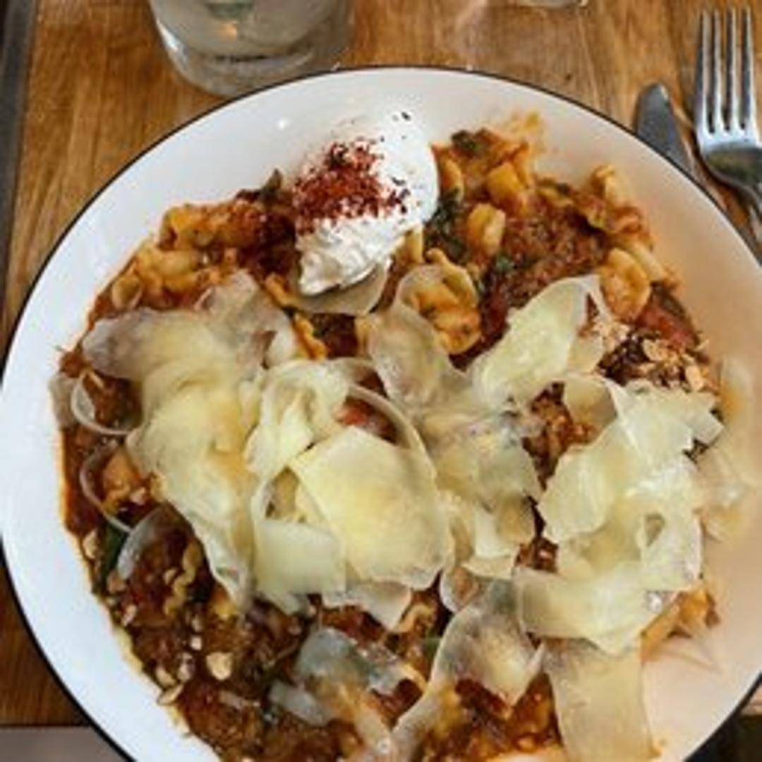 Campanelle pasta tossed with slow-braised lamb ragu, often featuring aromatic vegetables and herbs, and finished with a touch of cheese.