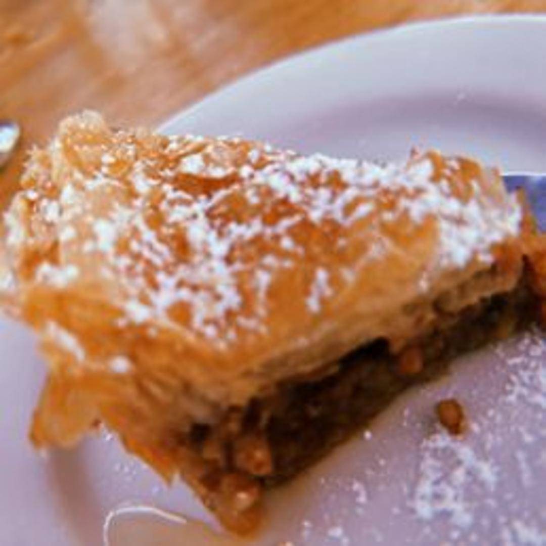 A sweet pastry made with layers of flaky phyllo dough, filled with chopped nuts and soaked in a honey syrup.