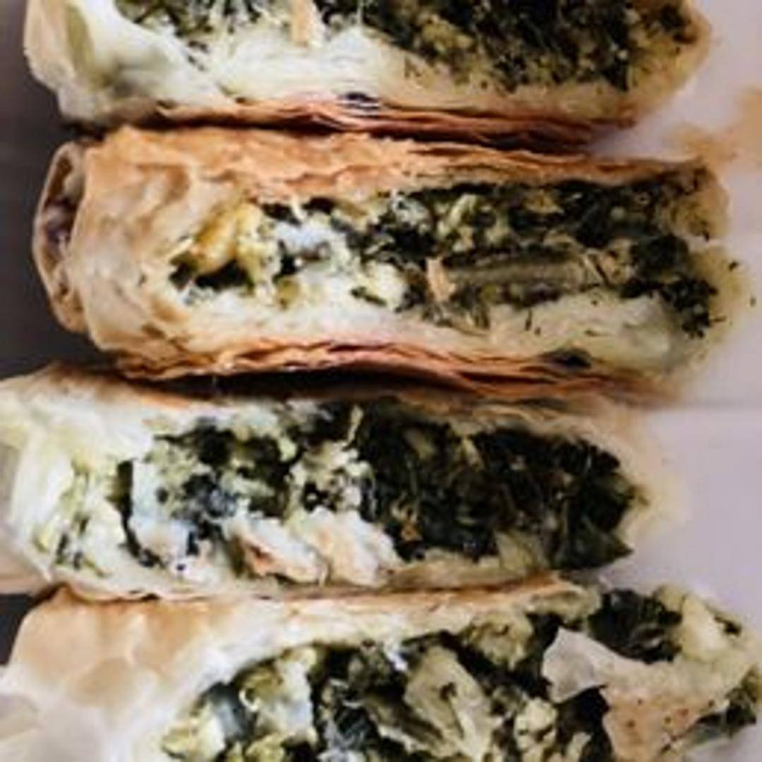 A savory Greek pastry filled with spinach, feta cheese, onions, and herbs, baked in flaky phyllo dough.