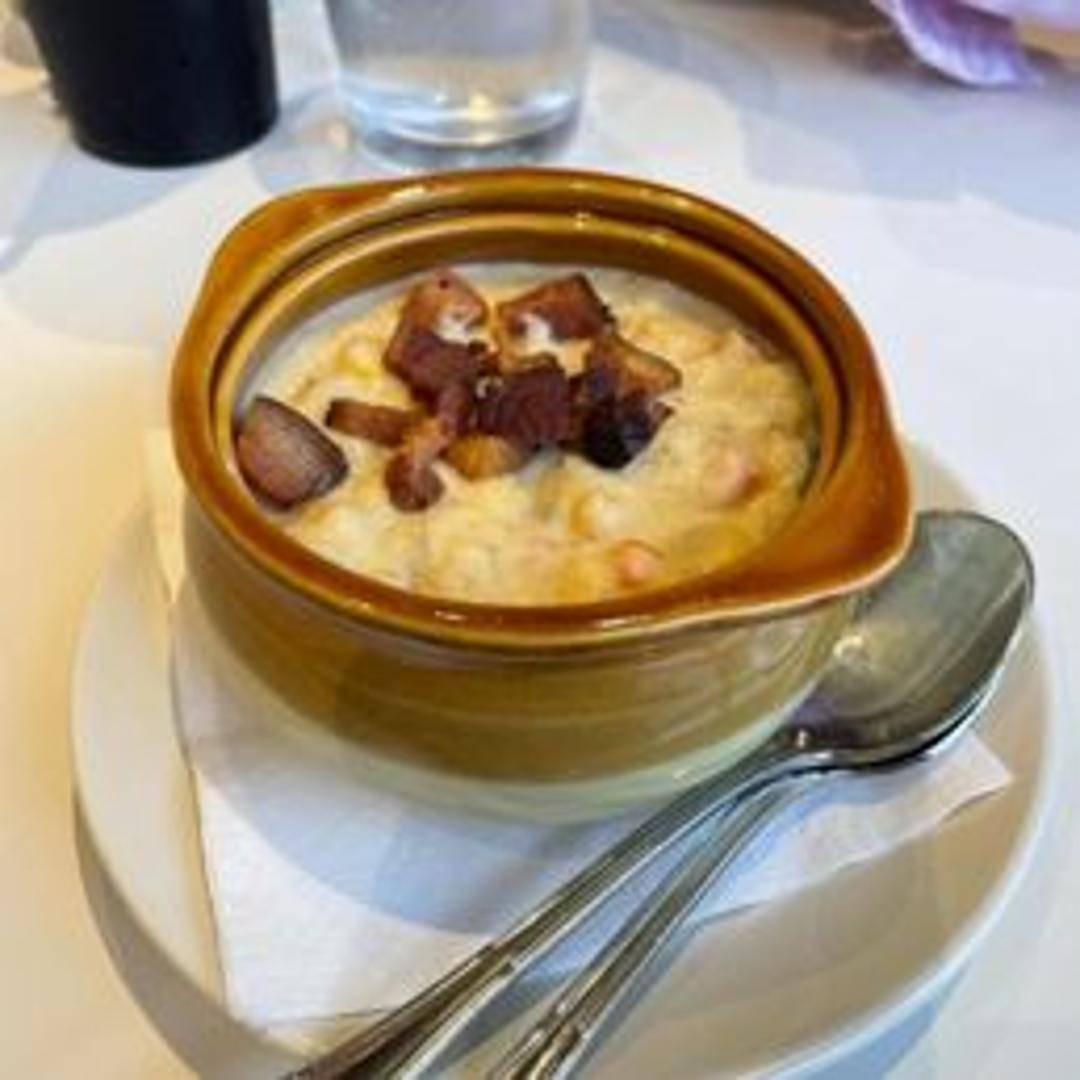 A creamy and savory chowder featuring sweet corn, crispy bacon, potatoes, and a blend of herbs and spices. Served hot.