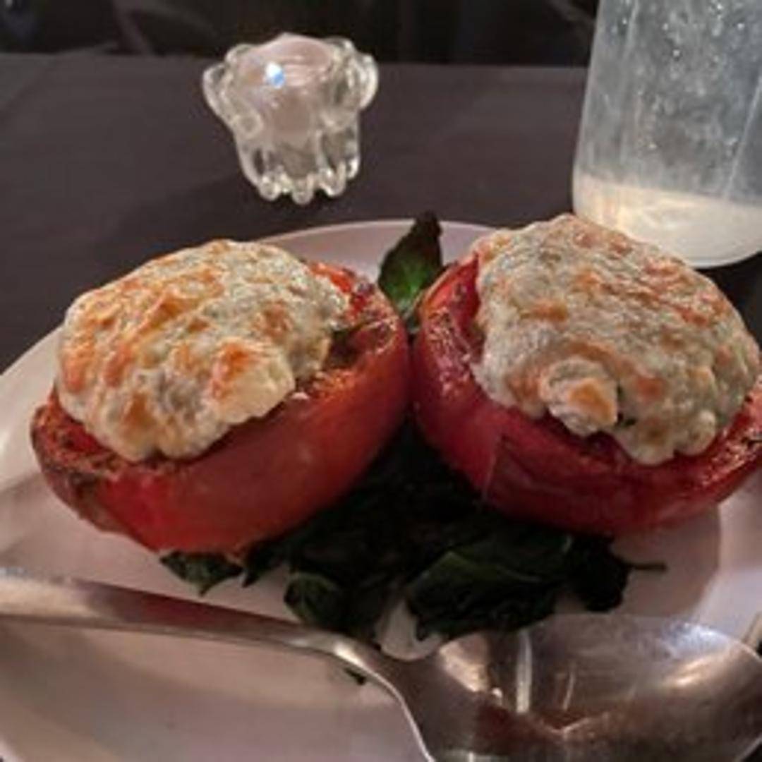 Fresh, ripe tomatoes, halved and broiled to perfection. Seasoned with herbs and spices, offering a savory and slightly sweet flavor profile. Garnished with a balsamic glaze and fresh basil.