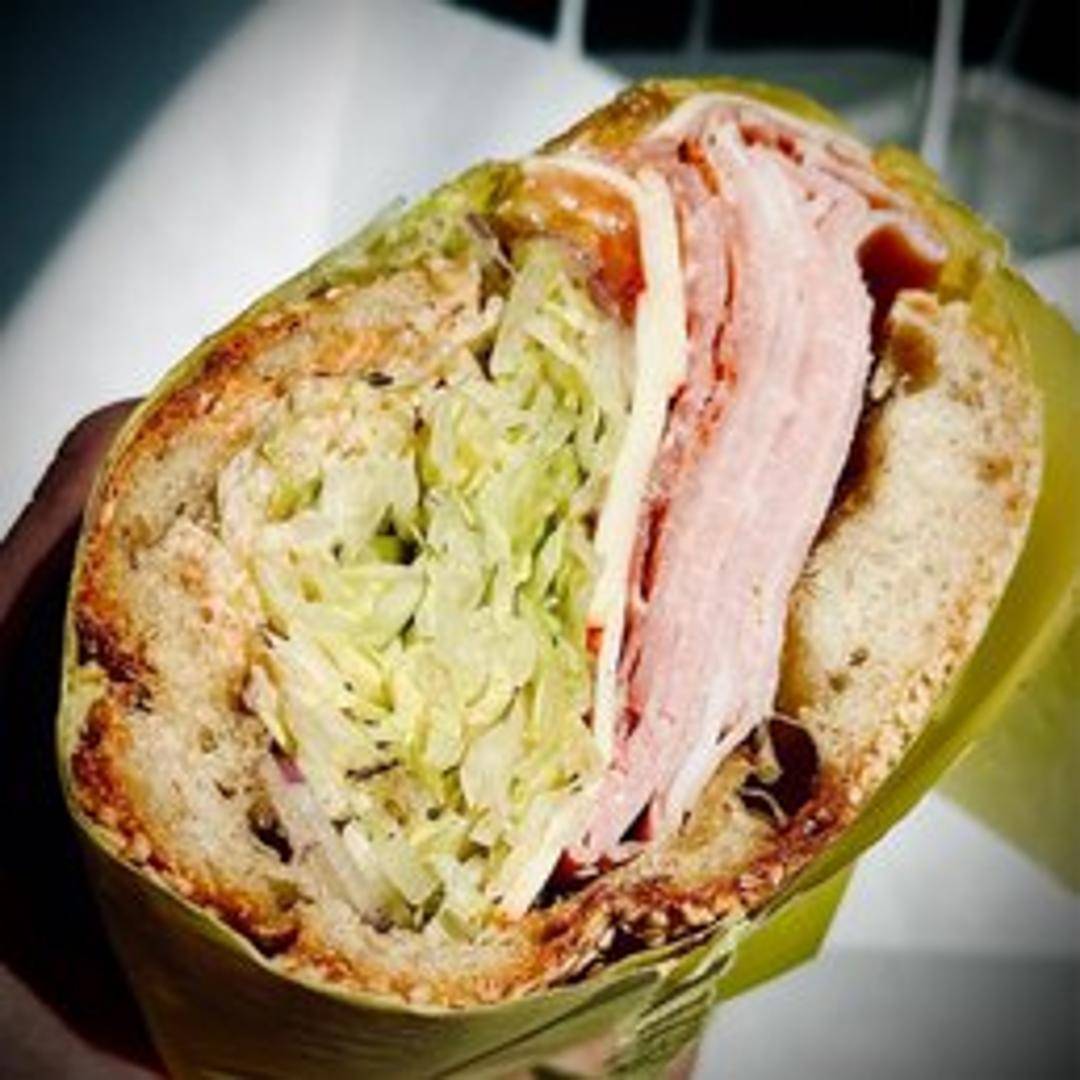 A classic Italian sandwich featuring assorted Italian cold cuts such as salami, mortadella, and prosciutto, with provolone cheese, lettuce, tomato, onion, and Italian dressing on a fresh roll.