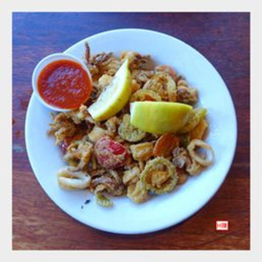 Crispy fried calamari rings and tentacles, seasoned and served with a side of marinara sauce and lemon wedges.