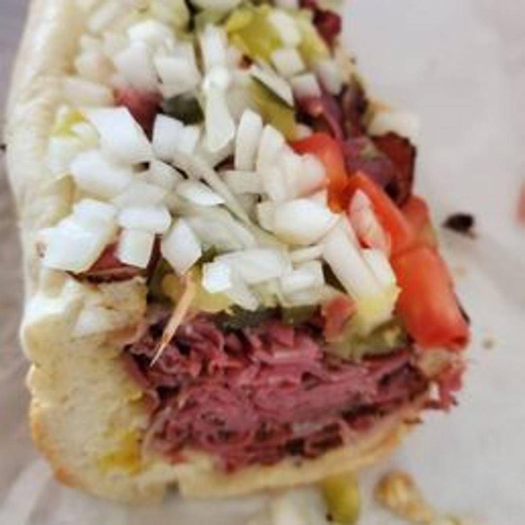 Thinly sliced, hot pastrami piled high on a freshly baked roll. Served with mustard.