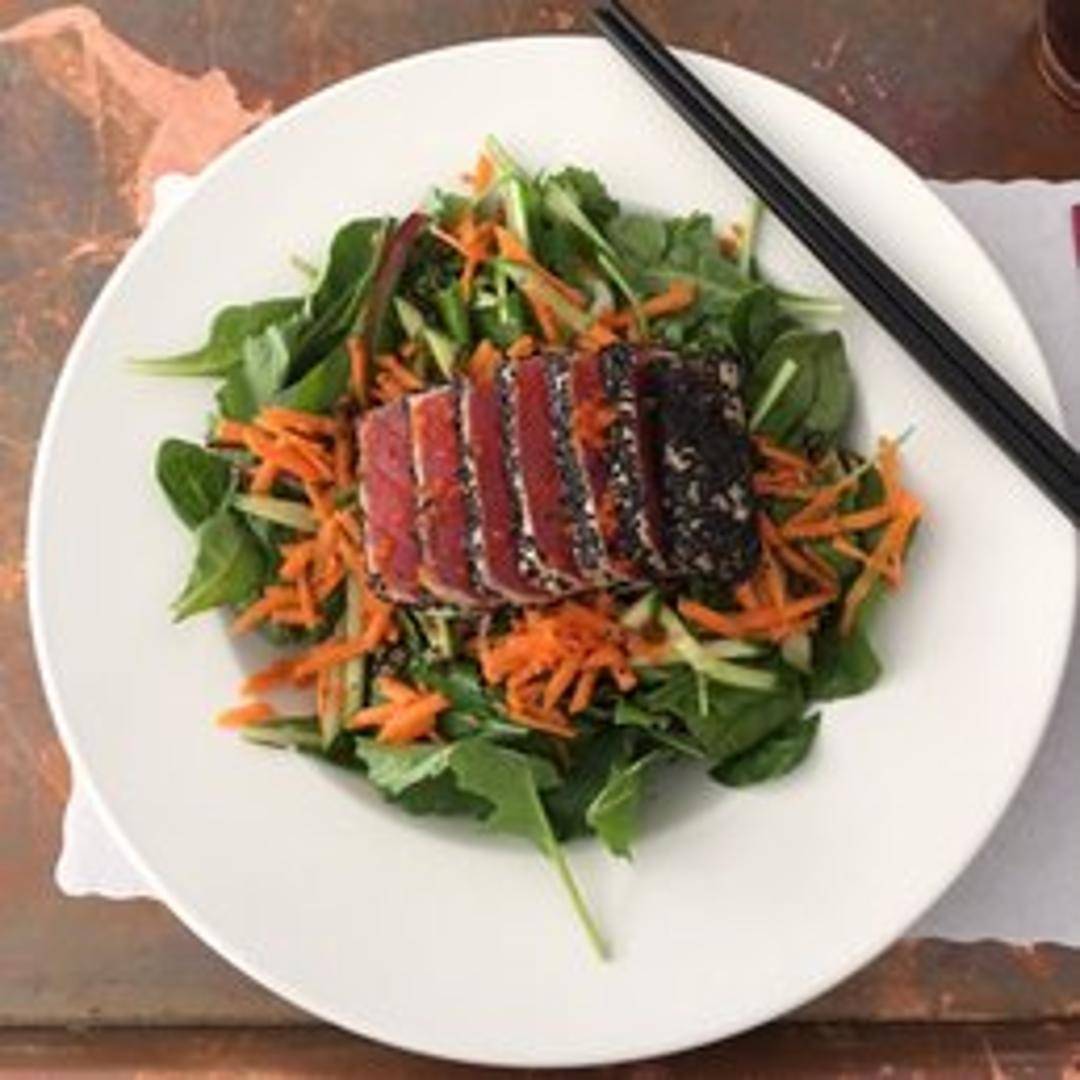 A vibrant and flavorful salad featuring perfectly seared, sushi-grade tuna. Served atop a bed of mixed greens with a medley of fresh vegetables, such as cucumbers, tomatoes, and bell peppers. Tossed in a light and tangy vinaigrette dressing. May include other seasonal vegetables and garnishes.