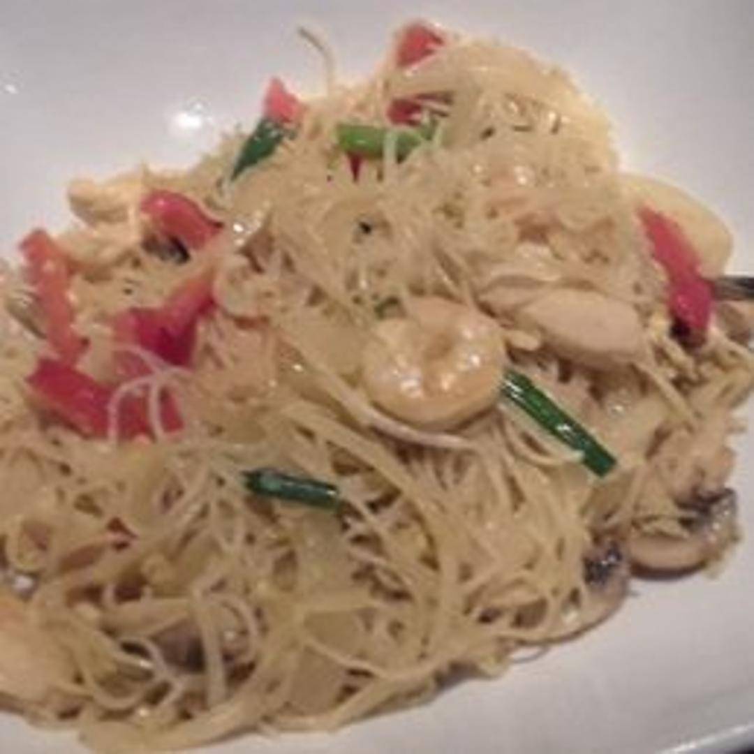 A vibrant and aromatic stir-fry featuring thin rice vermicelli noodles tossed with tender shrimp, scrambled egg, and an assortment of crisp vegetables such as bell peppers, onions, and carrots. All ingredients are infused with a fragrant curry spice blend, delivering a harmonious balance of savory and subtly spicy flavors.