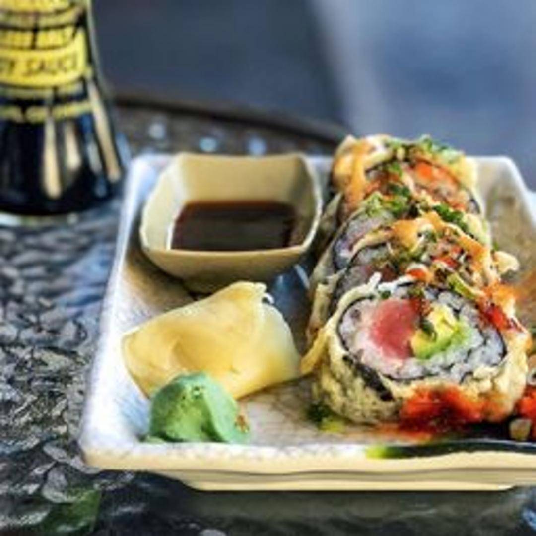 An exciting and flavorful sushi creation featuring a tantalizing blend of spicy tuna and tempura crunch, meticulously rolled with fresh avocado. Each piece is artfully topped with vibrant red masago and drizzled with a zesty chili sauce, delivering a kick of heat and a delightful textural contrast.