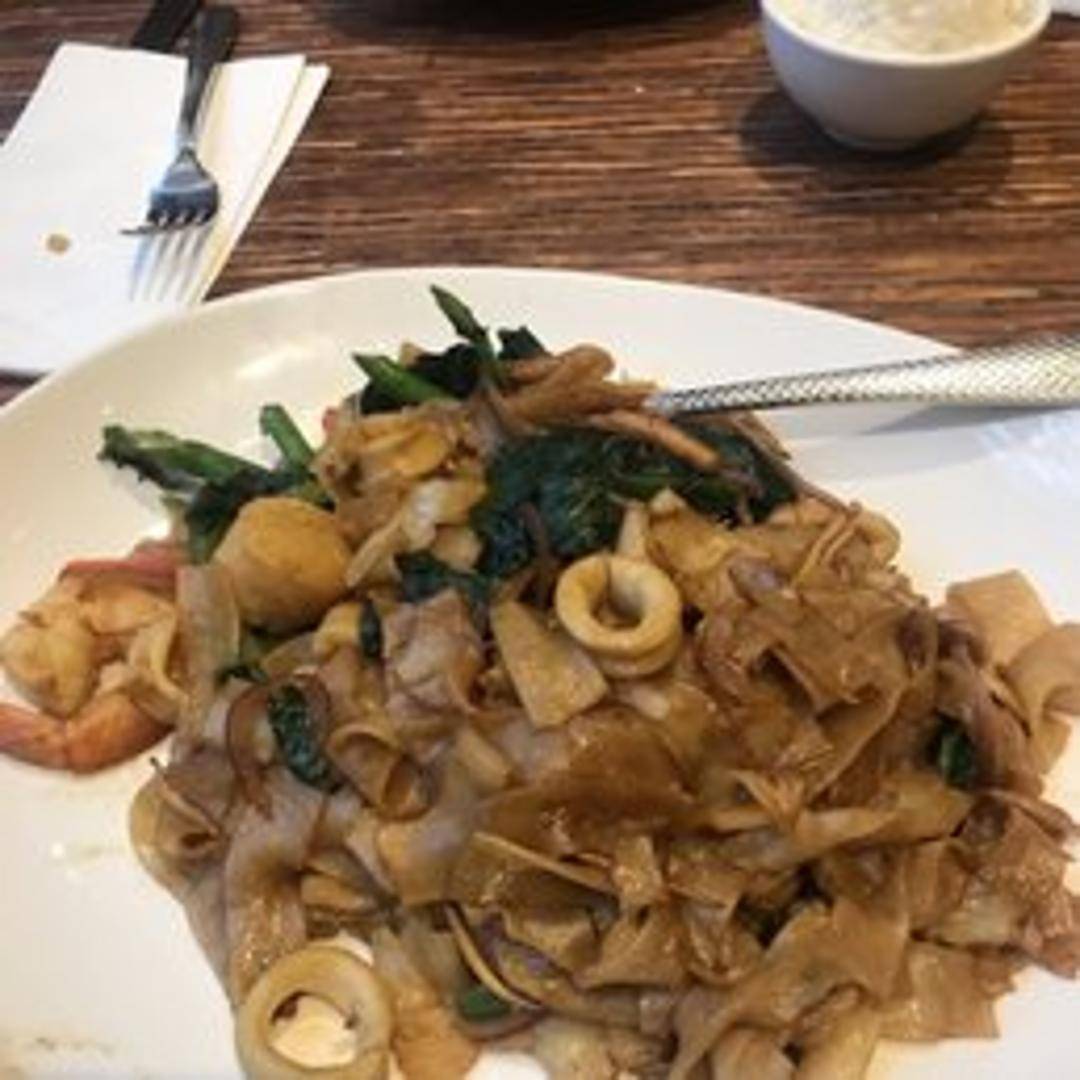 A fiery and flavorful stir-fried noodle dish featuring broad, chewy rice noodles tossed with an exquisite medley of fresh seafood, including succulent shrimp, tender calamari, and plump mussels. This vibrant creation is elevated by the aromatic presence of holy basil, crisp bell peppers, onions, and a spicy, savory sauce, delivering a thrilling culinary experience.