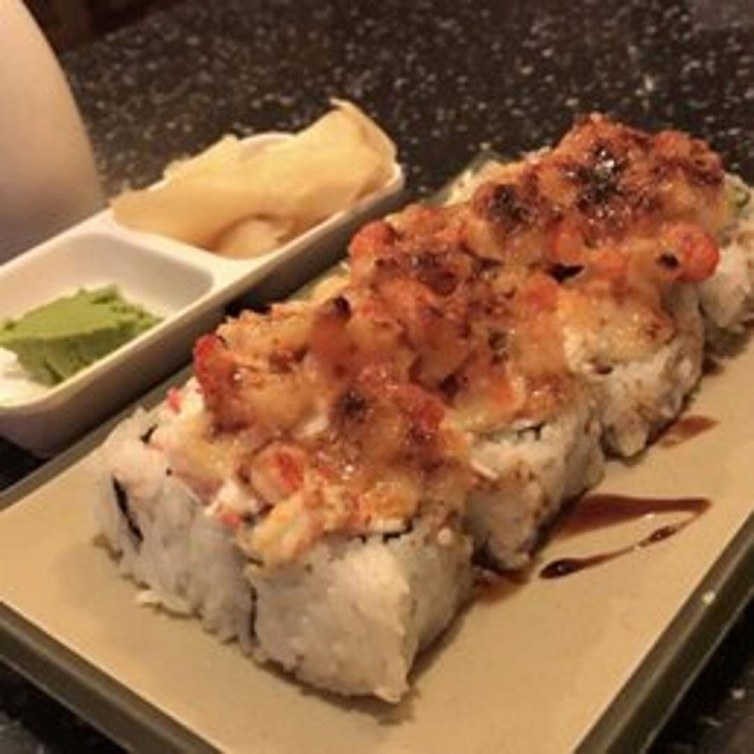A sushi roll filled with lobster meat, avocado, and other ingredients such as cucumber and mayonaise.