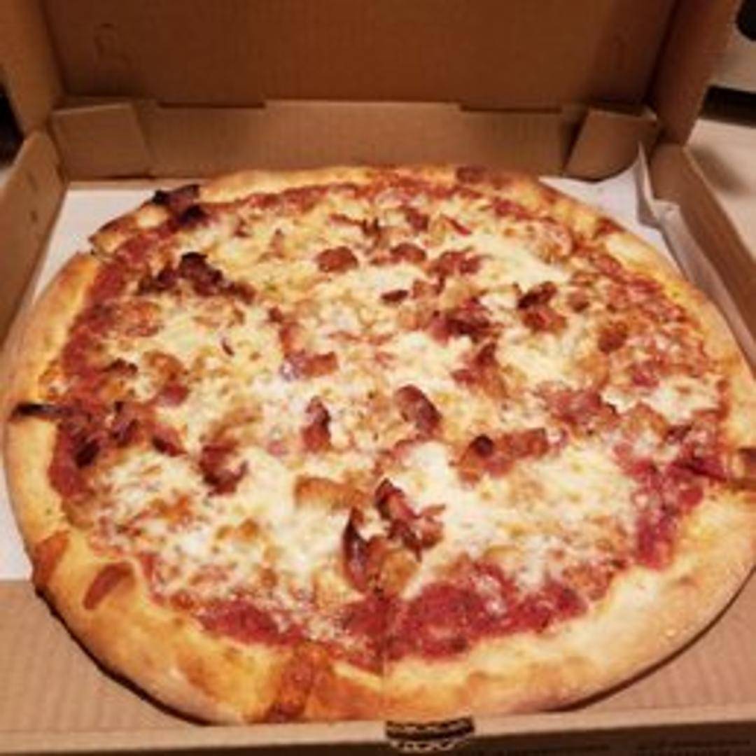 A crispy pizza crust topped with Giorgio's signature tomato sauce, a generous layer of melted mozzarella cheese, and crispy, smoky bacon.