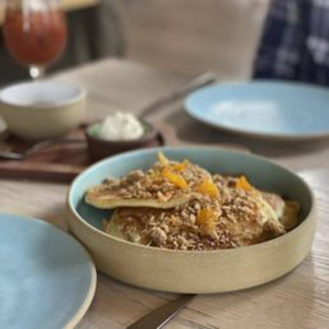 Fluffy sourdough pancakes bursting with fresh blueberries. Served with a side of sweet cream butter and warm maple syrup.