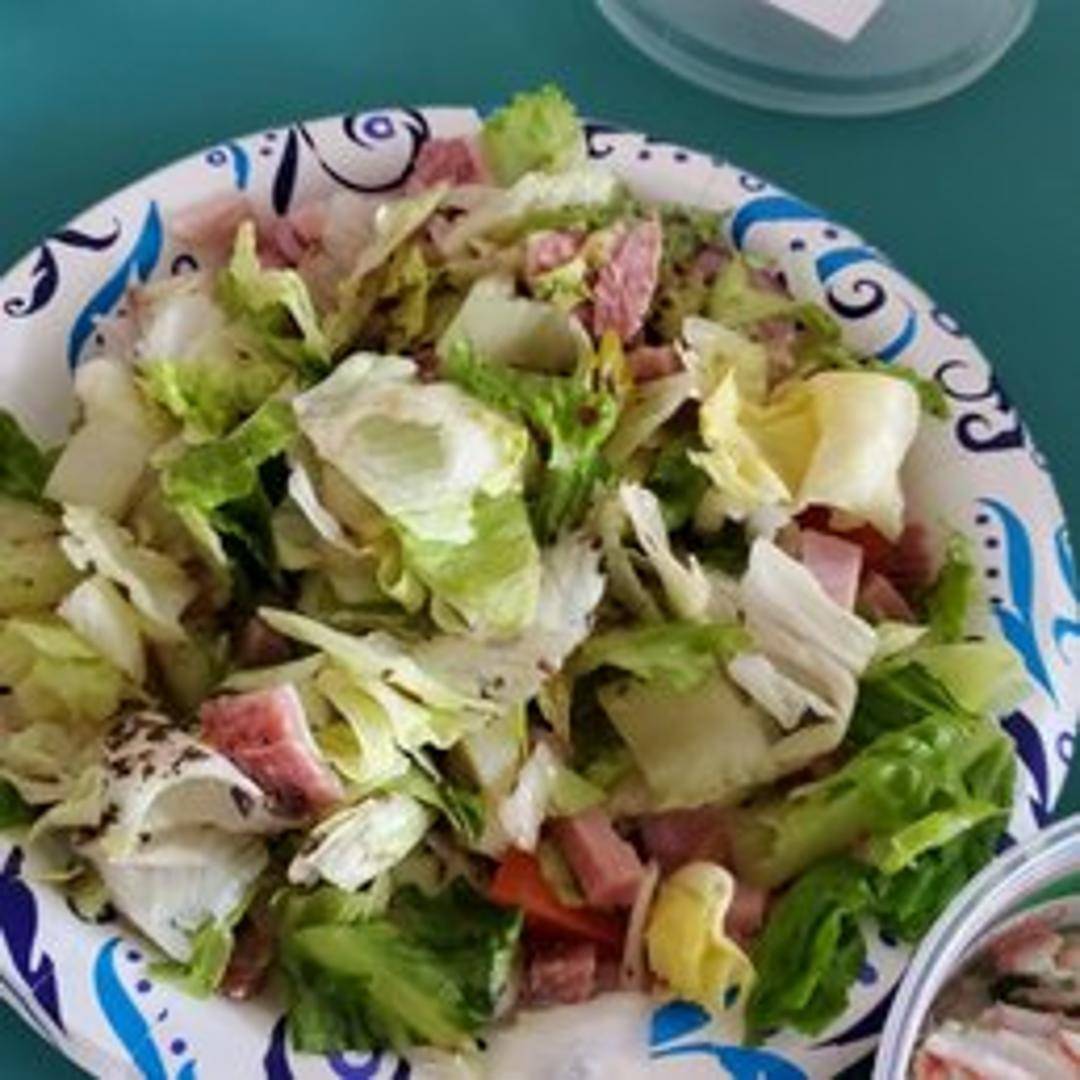 A vibrant salad with a medley of Italian cured meats, cheeses, olives, marinated vegetables, and lettuce, tossed with a tangy vinaigrette.