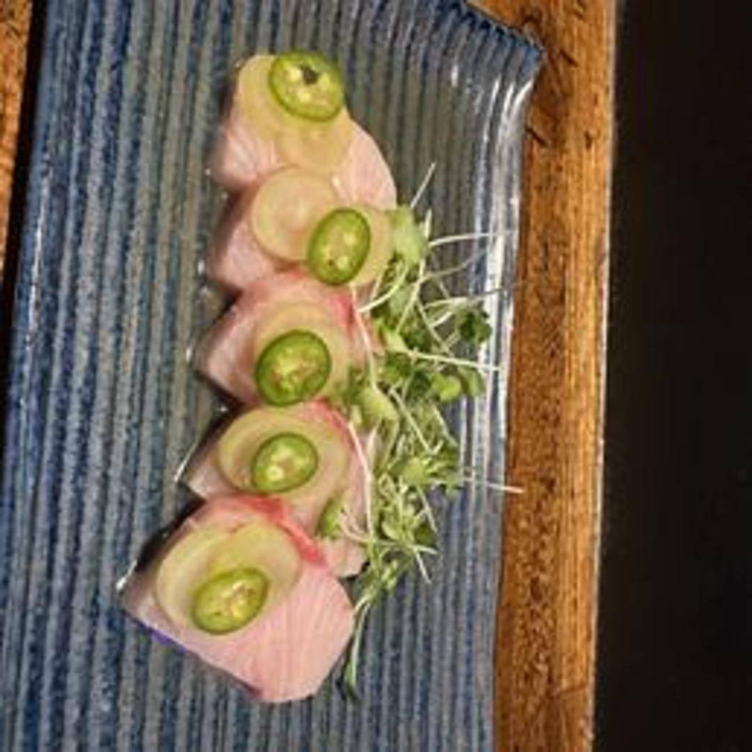 Fresh hamachi (yellowtail) sashimi, prepared and served with traditional accompaniments.
