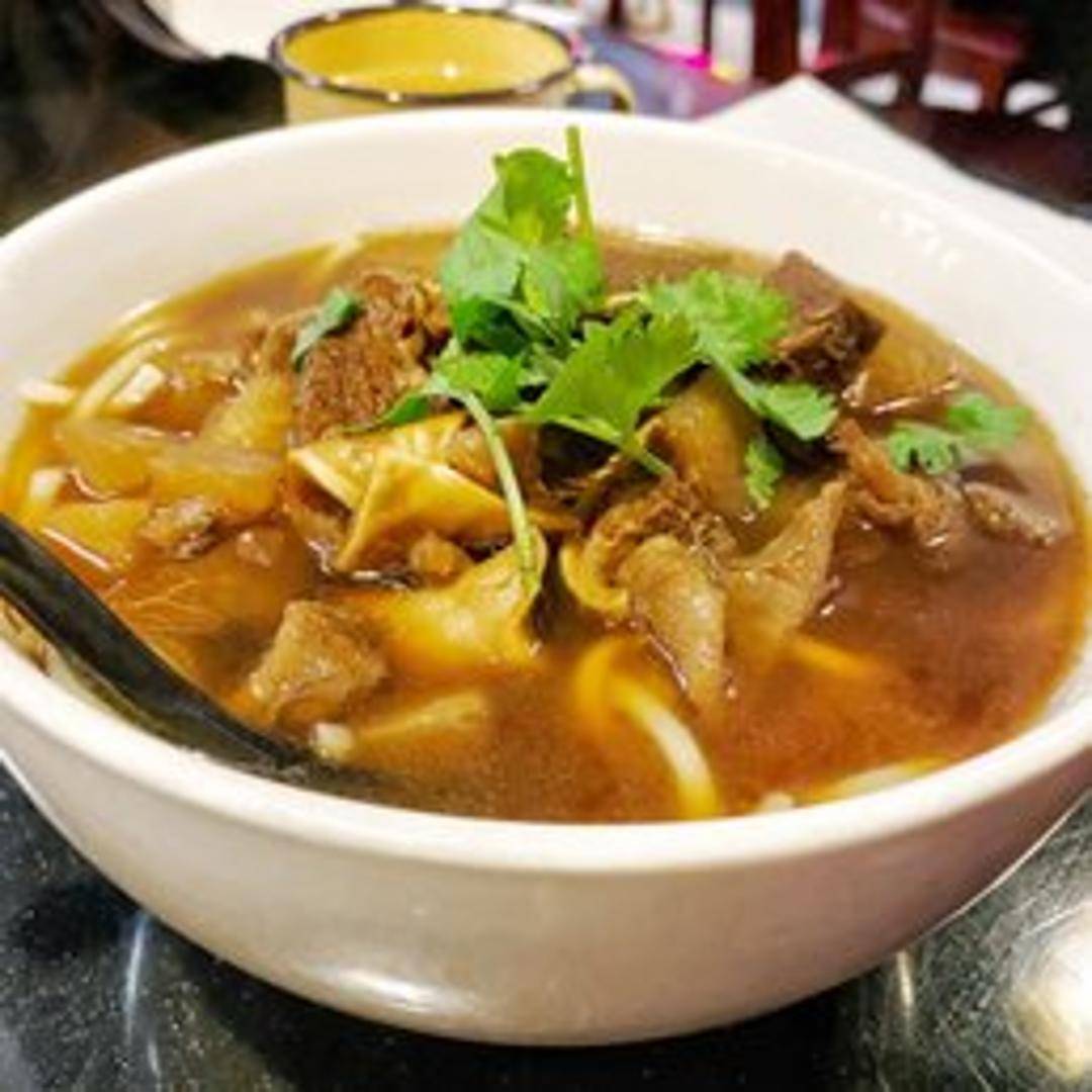 Tender braised beef simmered in a rich and flavorful broth, served over a bed of noodles. Contains a mix of vegetables and spices for added depth and complexity. A comforting and hearty noodle soup.