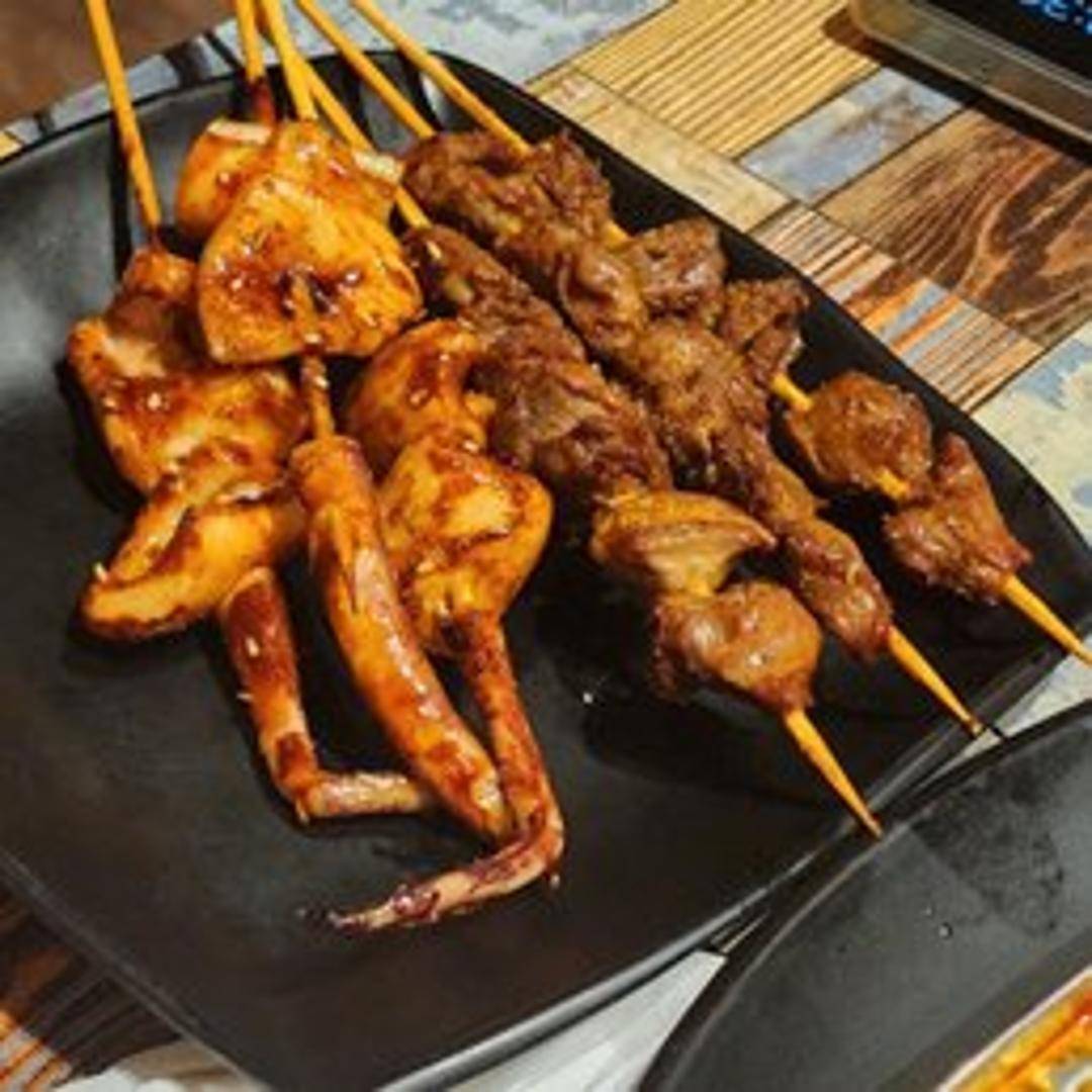 Tender pieces of squid, marinated and grilled on a skewer. Lightly seasoned to enhance the natural flavor, with a slightly smoky char. Served with a complementary dipping sauce (specify sauce if known, e.g., sweet chili sauce).