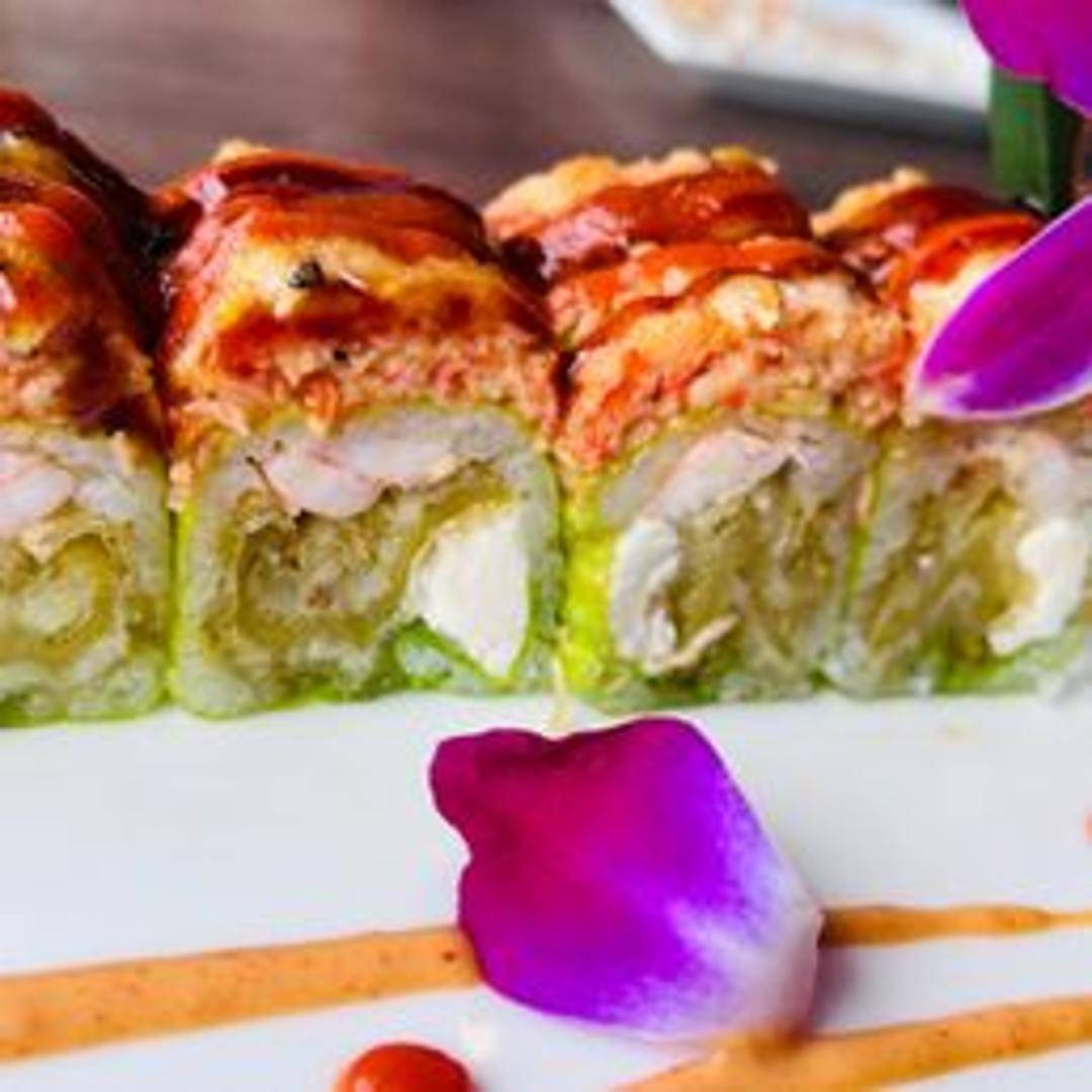 Shrimp tempura and avocado roll, topped with spicy tuna, crunch, and a special sauce.