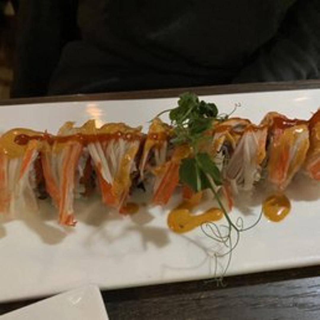 Spicy tuna roll topped with fresh tuna and chili sauce.