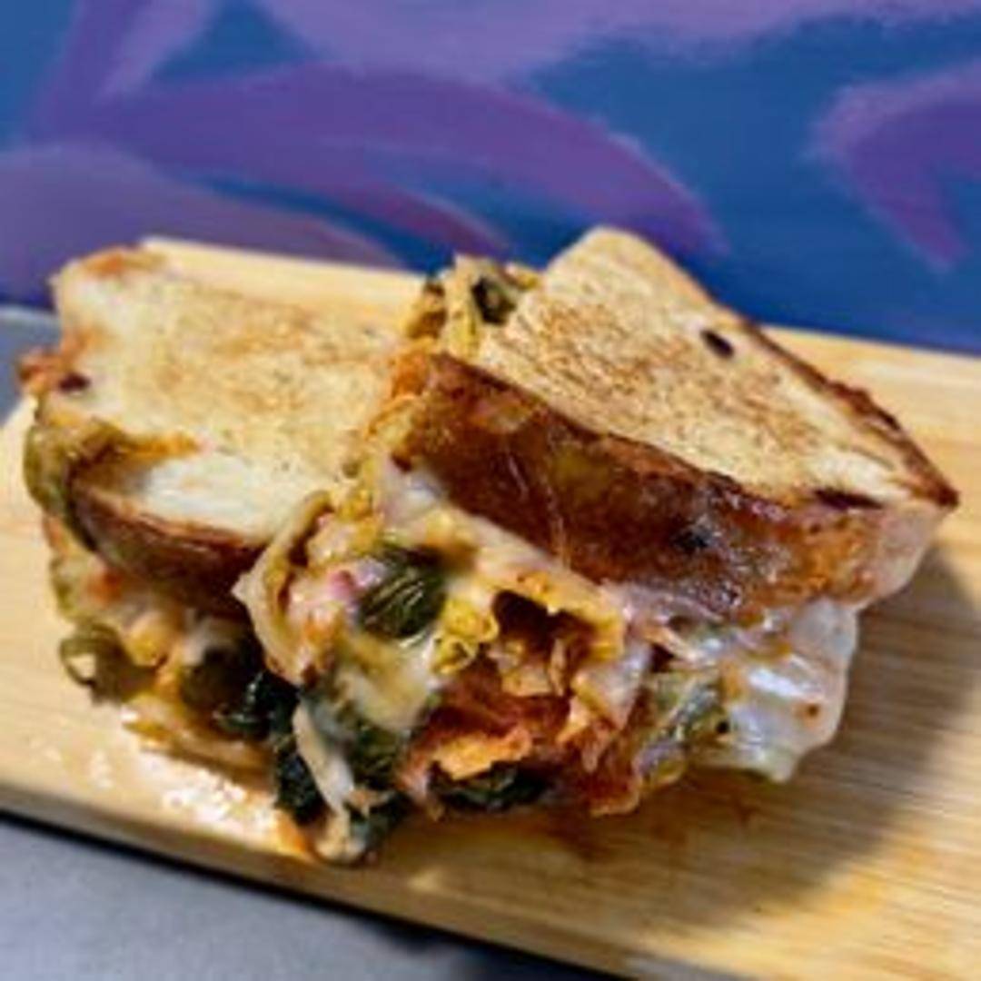 A savory grilled cheese sandwich featuring tangy kimchi and melted cheese between slices of grilled bread. Served with a side of refreshing fres.