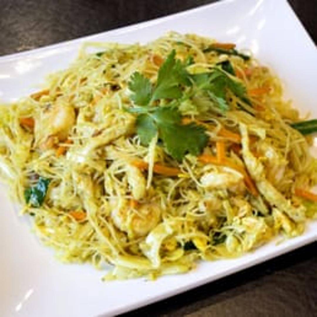 Thin rice noodles stir-fried with shrimp, chicken, char siu pork, vegetables, and curry powder. A flavorful and slightly spicy Southeast Asian-inspired dish.