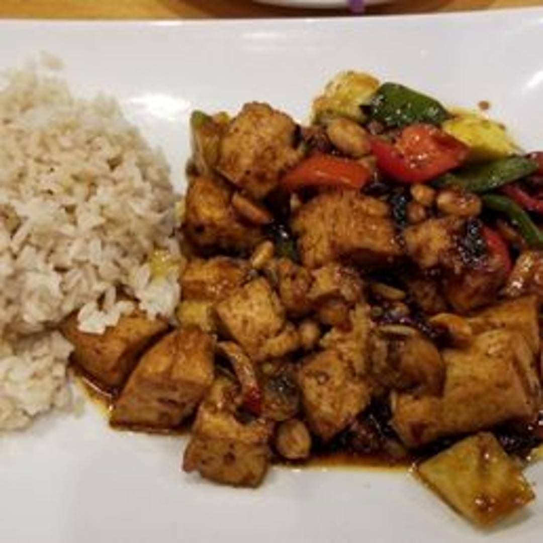 A spicy and savory stir-fry dish featuring peanuts, vegetables, and your choice of protein (chicken, beef, shrimp, or tofu) in a flavorful chili-garlic sauce. Garnished with dried chili peppers and scallions.
