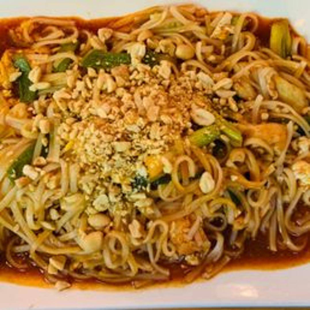 Rice noodles stir-fried with shrimp, chicken, bean sprouts, egg, and scallions in a tangy tamarind sauce, topped with crushed peanuts and a lime wedge.