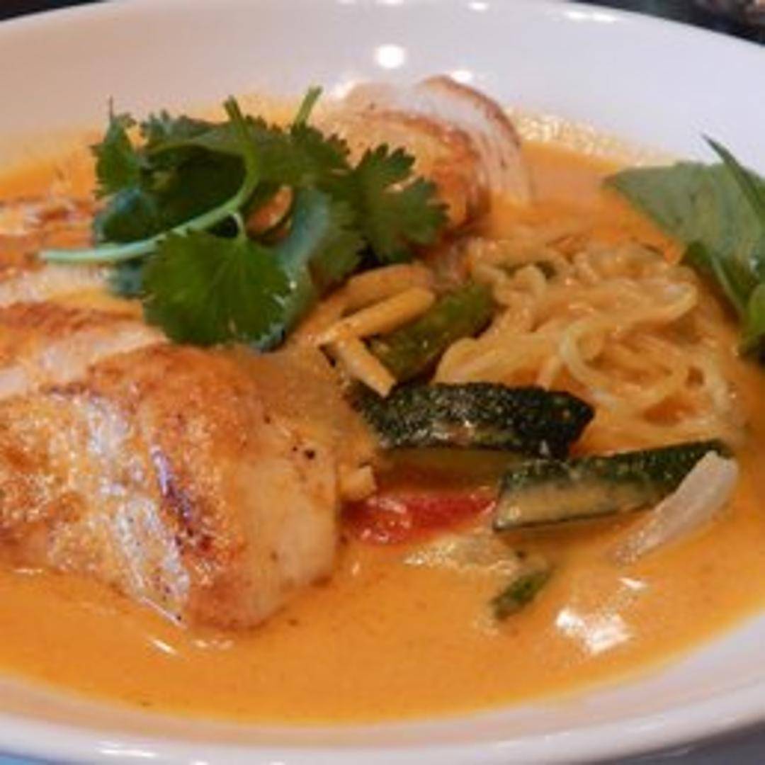 A rich and aromatic curry made with red curry paste, coconut milk, bamboo shoots, bell peppers, and basil leaves. Served with your choice of protein (chicken, beef, shrimp, or tofu). Comes with steamed rice.