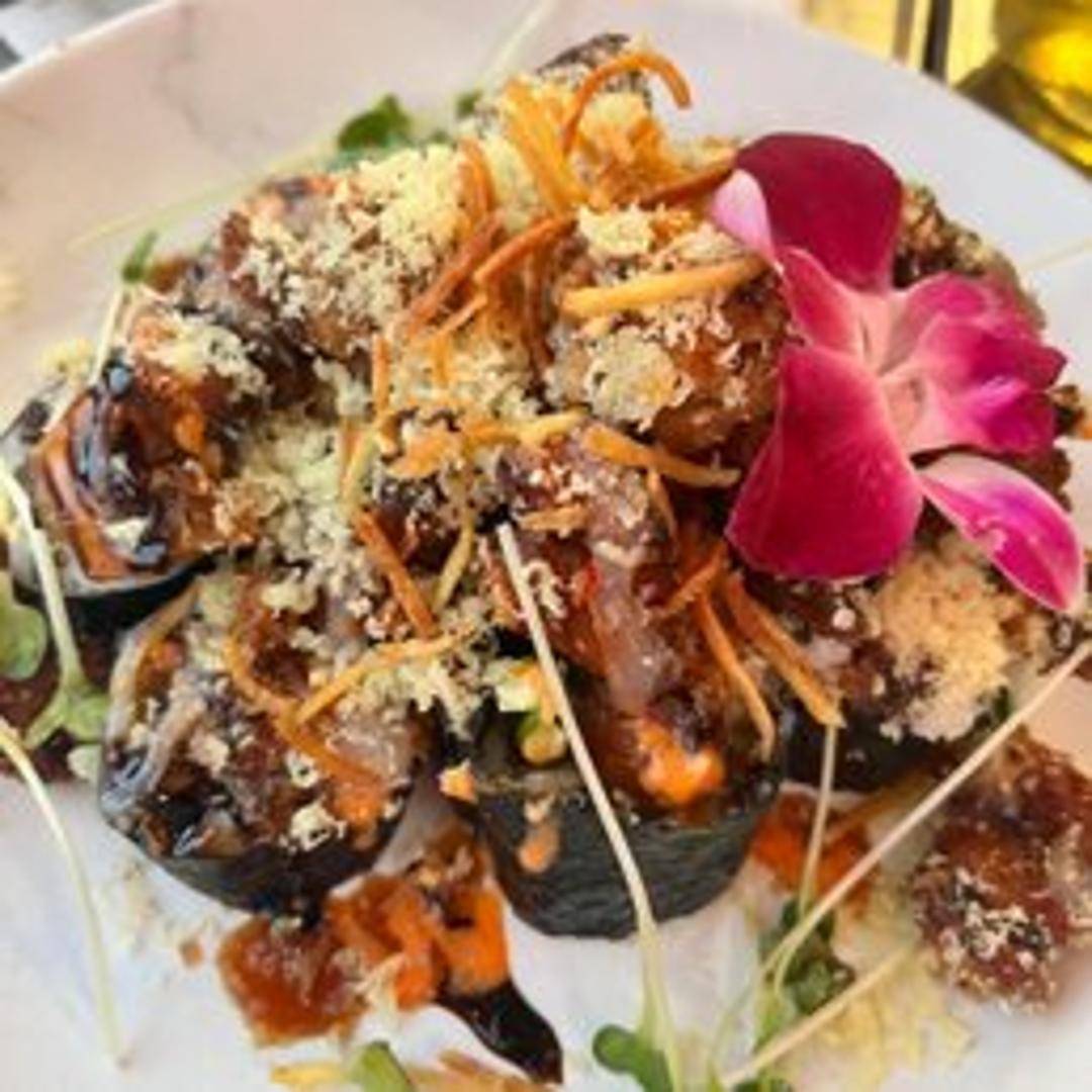 A spicy vegan sushi roll, often featuring a variety of vegetables, spicy vegan mayo, and possibly topped with a fiery sauce for an extra kick. The specific ingredients contributing to the 'volcanic' heat may vary.