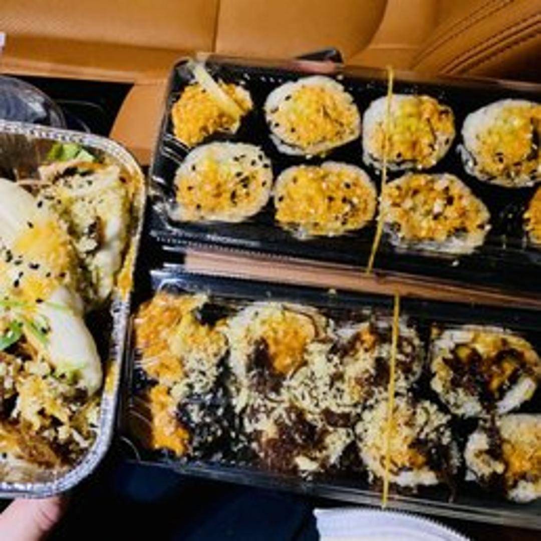 A spicy sushi roll featuring a plant-based tuna alternative, avocado, cucumber, and crunchy tempura flakes, all wrapped in seaweed and sushi rice. A delightful blend of textures and flavors with a spicy kick.