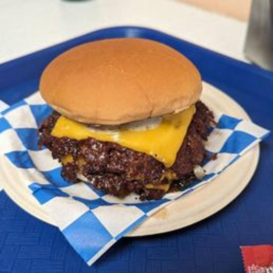 A thin and crispy smashed beef patty, American cheese, grilled onions, and pickles, served on a toasted bun.