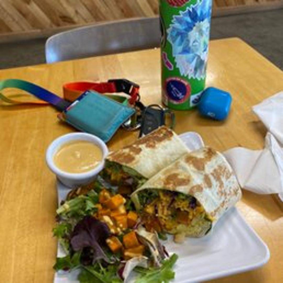A hearty and flavorful breakfast burrito filled with scrambled eggs, seasoned potatoes, melted cheese, and your choice of breakfast protein (vegetarian options available, like black beans or soy chorizo). Wrapped in a warm flour tortilla and served with a side of salsa. Optional additions include avocado, peppers, or onions.