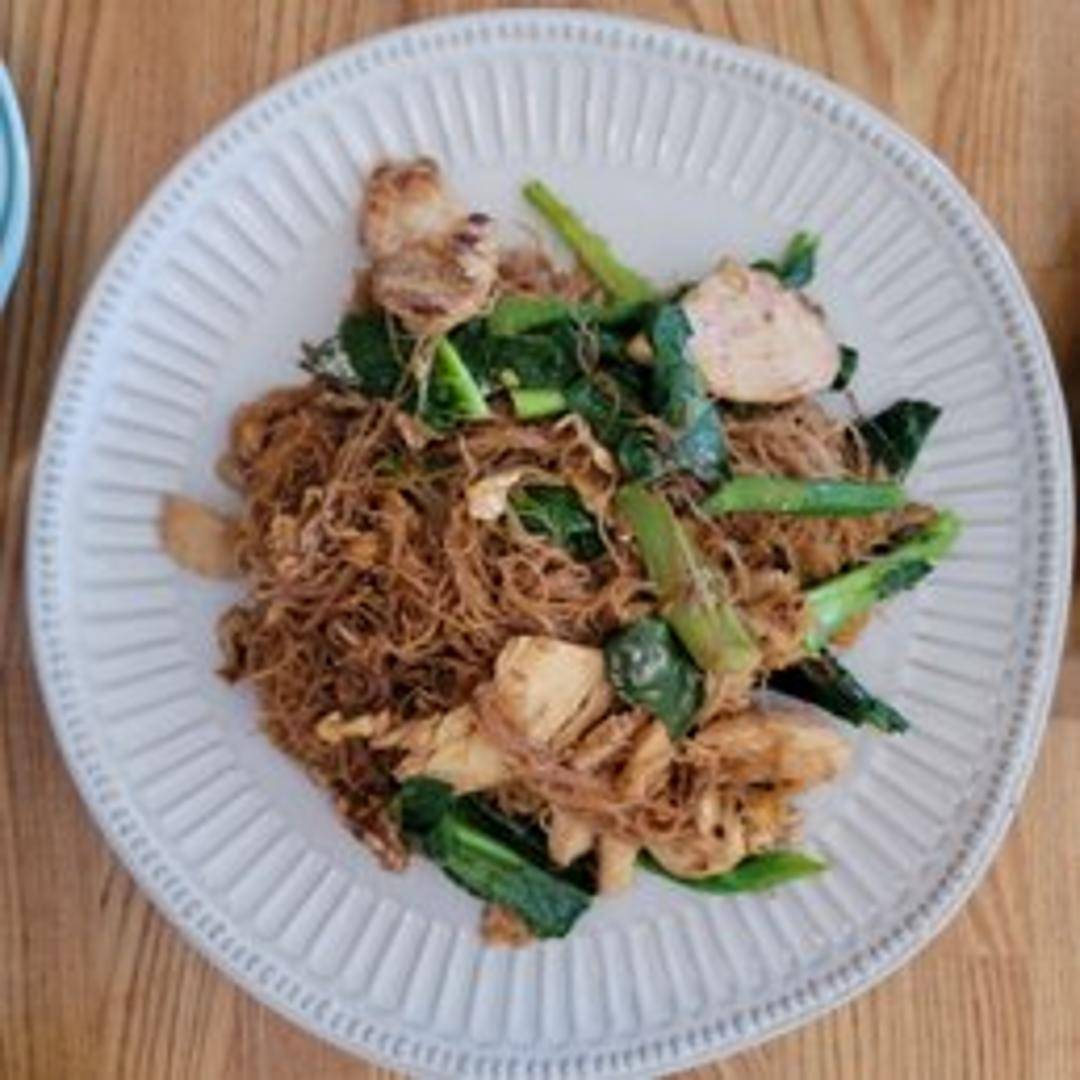 Wide rice noodles stir-fried with egg, Chinese broccoli, and your choice of protein in a sweet and savory soy sauce-based sauce.