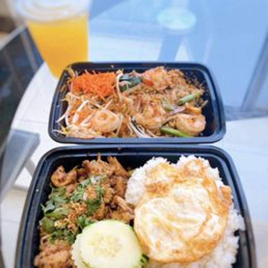A classic Thai noodle dish featuring stir-fried rice noodles with shrimp, tofu, bean sprouts, scrambled egg, and crushed peanuts in a savory-sweet tamarind sauce. Garnished with fresh lime wedges and cilantro.