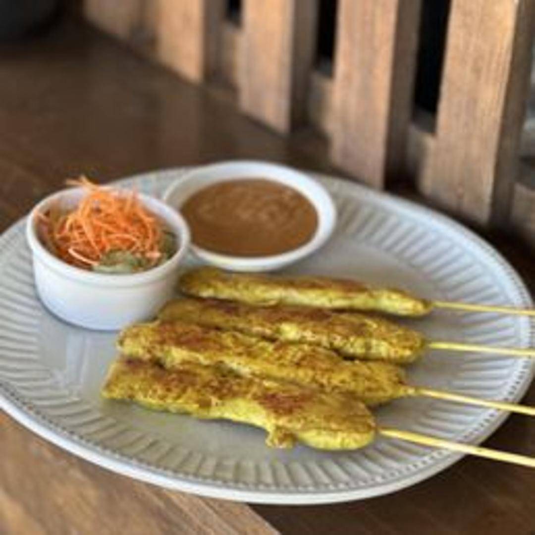 Grilled marinated chicken skewers served with a creamy peanut sauce. Garnished with pickled cucumber and red onions.