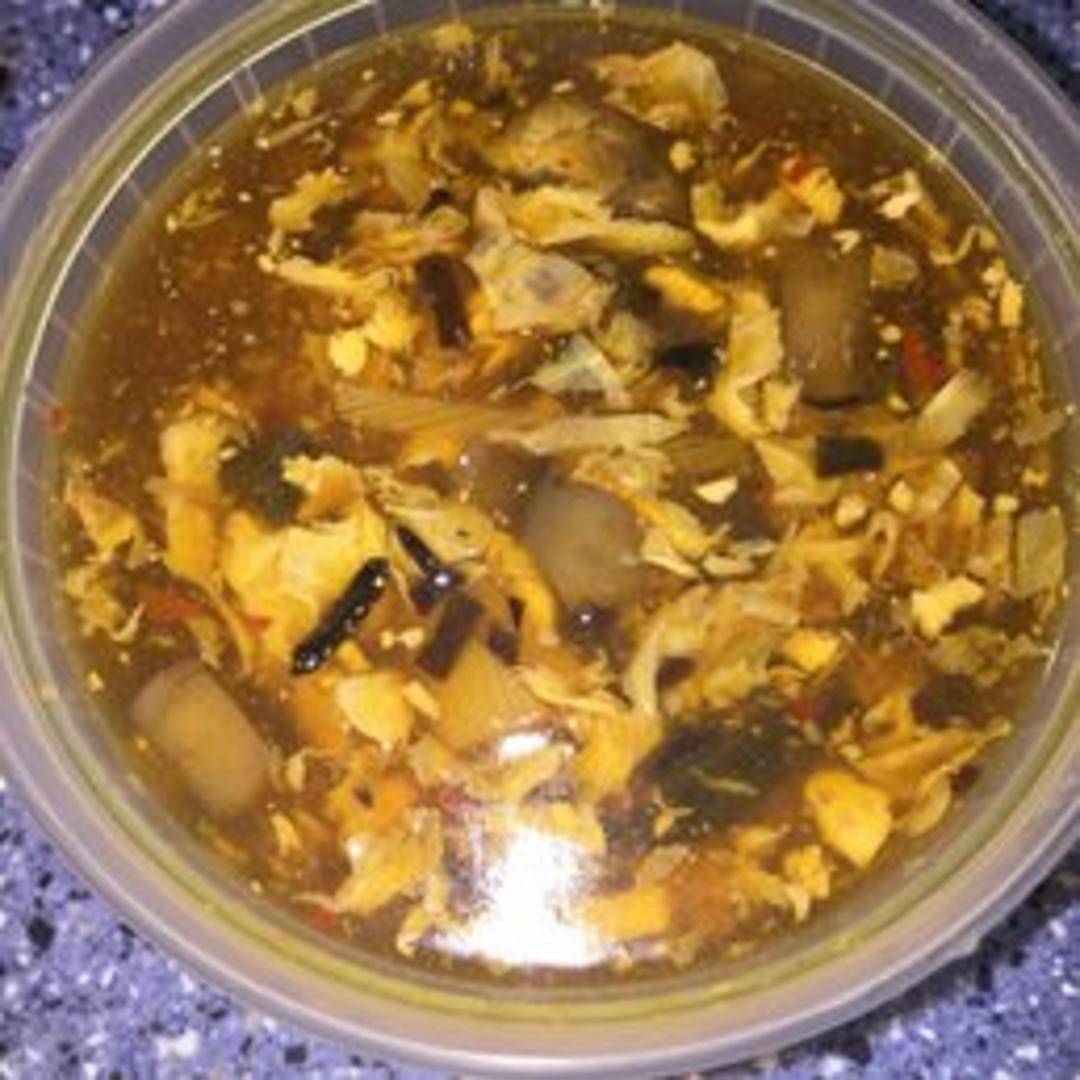 A traditional Chinese soup known for its unique balance of spicy and tangy flavors. Typically prepared with shredded pork, silken tofu, bamboo shoots, wood ear mushrooms, and whisked egg flowers in a rich, savory broth, finished with a hint of vinegar and white pepper.