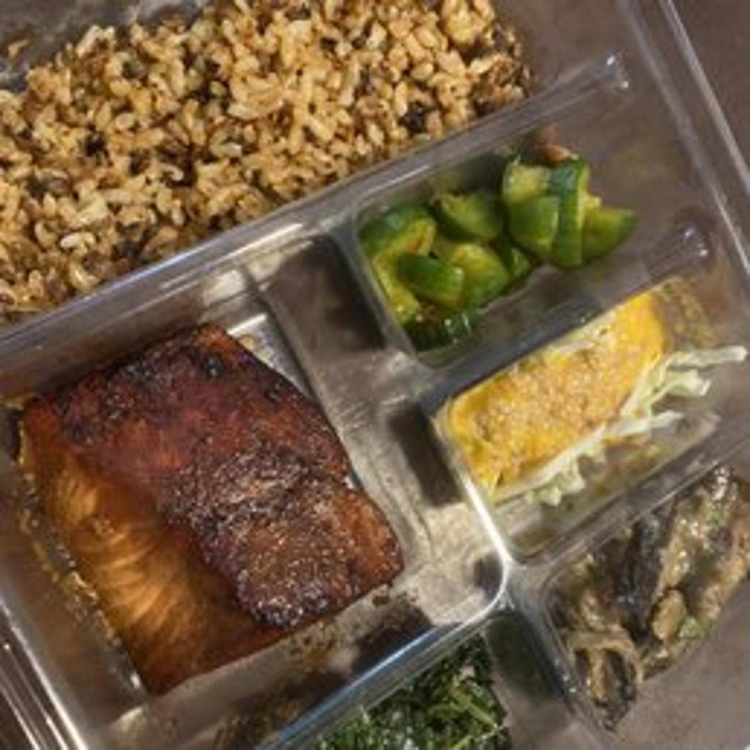 A balanced and convenient meal featuring a variety of fresh and healthy components, including protein (chicken, tofu, or fish), seasonal vegetables, grains, and a flavorful dipping sauce. A perfectly portioned and satisfying option.