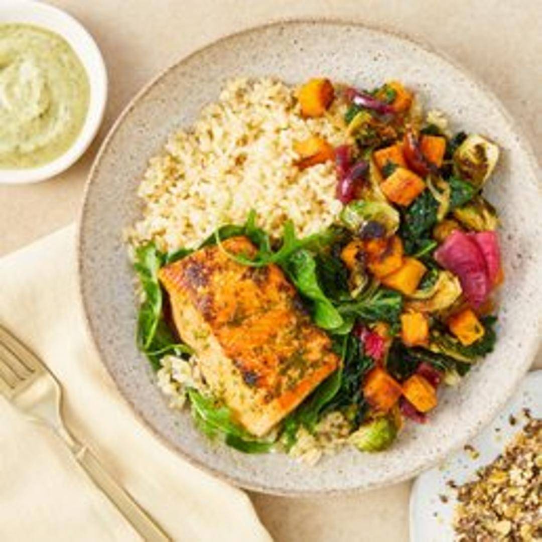 Roasted salmon served over a bed of seasonal grains (quinoa, farro), roasted autumn vegetables (butternut squash, Brussels sprouts), and topped with a flavorful dressing and crunchy seeds. A nourishing and satisfying bowl.