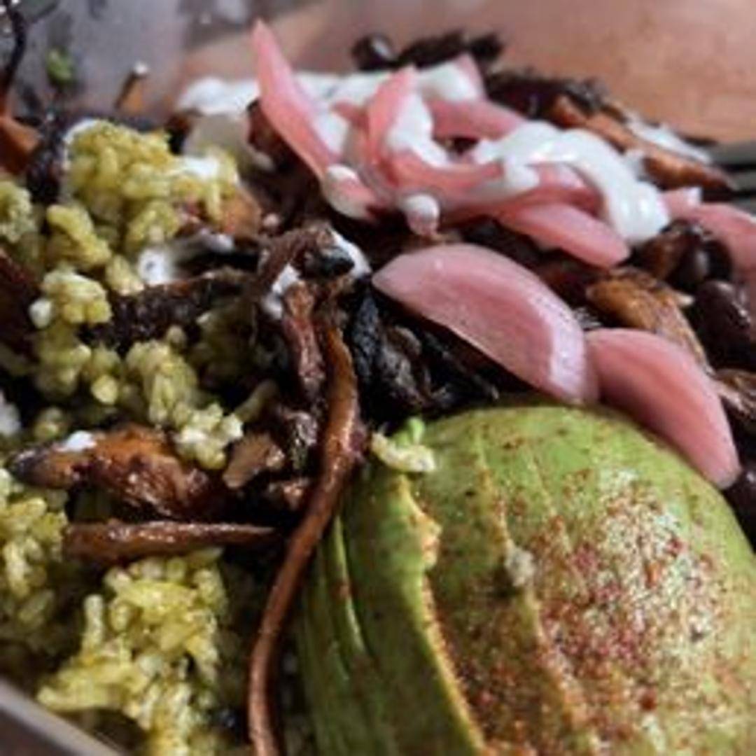 A flavorful and plant-based bowl featuring tender, seasoned mushroom carnitas. Served with a grain or rice base, toppings such as pico de gallo, avocado, pickled onions, and a vibrant sauce. A hearty and satisfying vegan option.